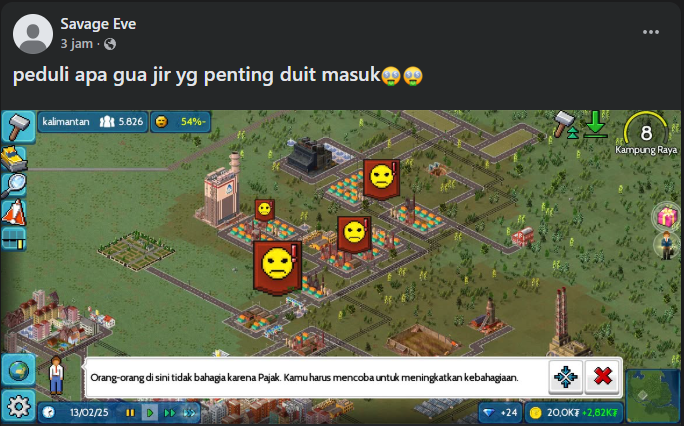 Permainan ini sering kali dimanfaatkan untuk memvisualisasikan contoh kebijakan yang tidak efektif – misalnya kenaikan pajak drastis, perubahan tata kota, atau protes warga besar-besaran yang kemudian dibagikan secara luas di Facebook, Instagram, dan Threads.