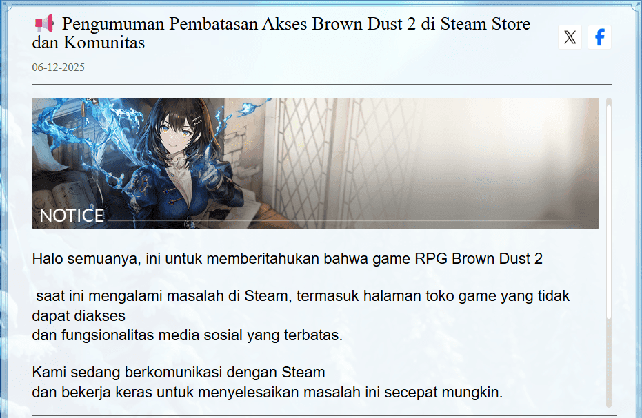 Sebelumnya BrownDust2 sempat mengumpulkan lebih dari 200.000 wishlist di Steam sebelum akhirnya halaman toko dan Community Hub-nya dihapus kurang lebih satu minggu sebelum jadwal rilis pada pertengahan Desember 2025.