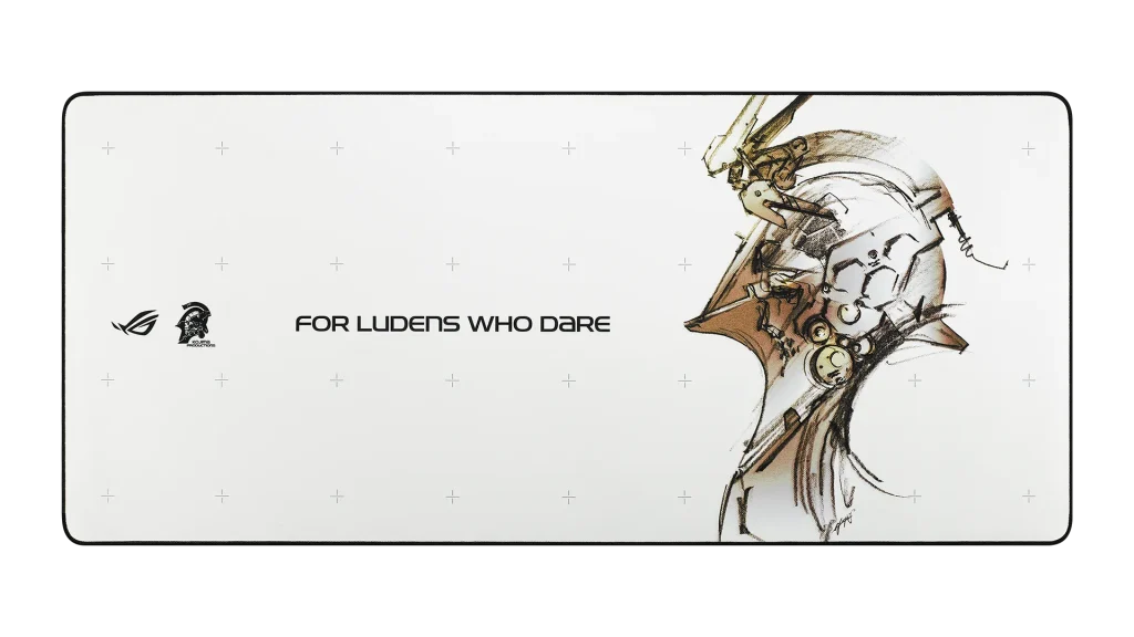 Seluruh peripheral ini menampilkan slogan For Ludens Who Dare sebagai simbol perpaduan identitas Kolaborasi ASUS ROG dan Kojima Productions.